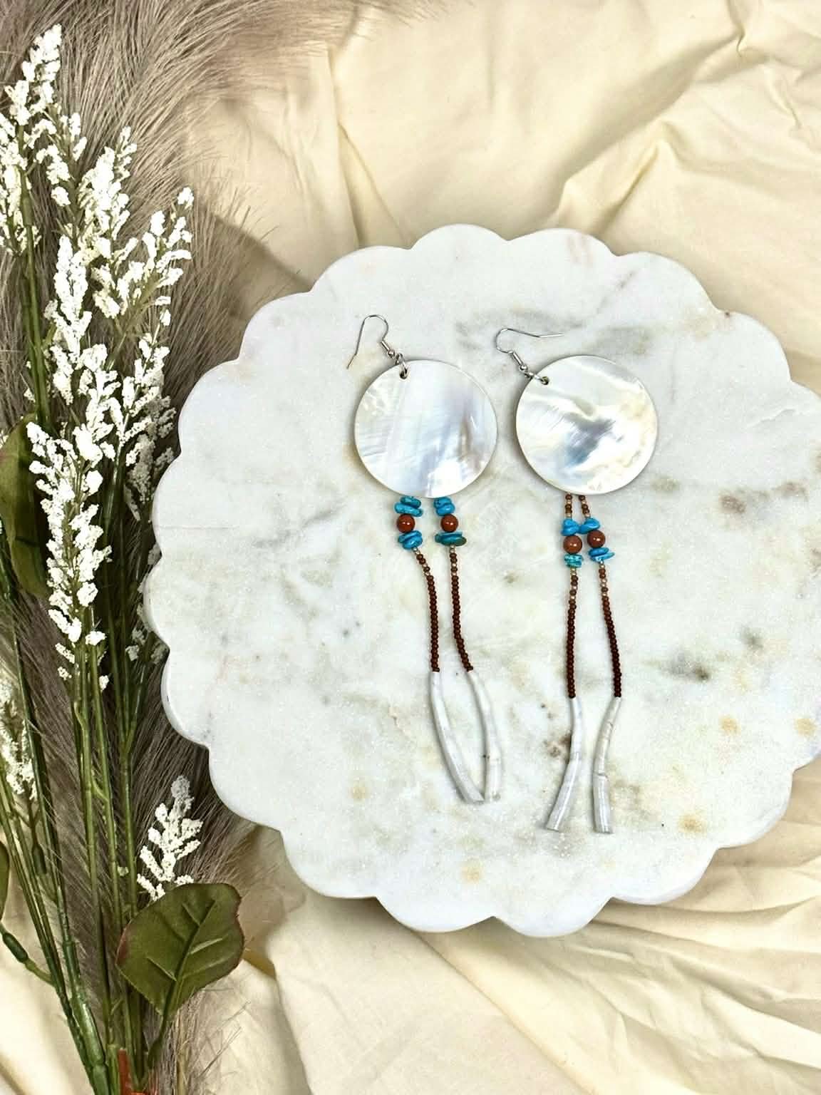 These earrings combine luminous shell discs with turquoise and small brown seed beads for balance and movement. The design feels organic, flowing like water and grounded by earthy tones—a versatile pair that carries both elegance and spirit.